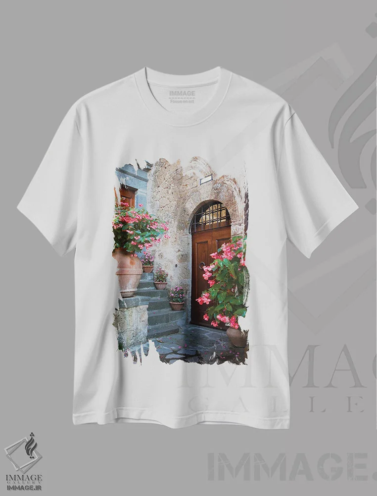 تیشرت سفید طرح دار آثار جولی اگِرز - immage.ir تیشرت طرح دار Portugal, Obidos, Portugal,شکوفه های زیبای گل کاغذی در شهر یک، اوبیدوش، پرتغال اثر جولی اگِرز