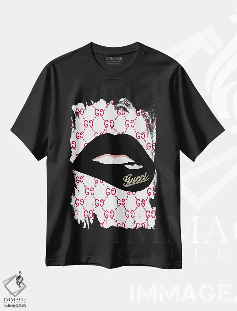 تیشرت مشکی طرح دار لب های گوچی، هنر دیجیتال اثر جولی شریبر | فروشگاه ایماژ تیشرت طرح دار لب های گوچی اثر جولی شریبر
