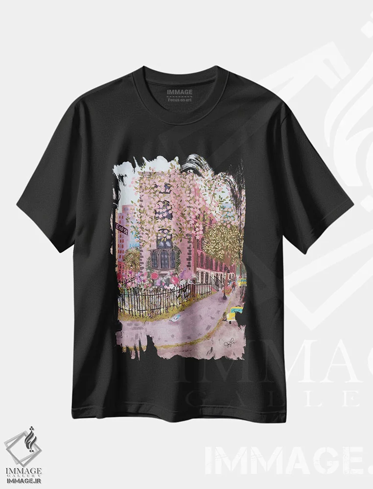 تیشرت سفید طرح دار رویای صورتی خیابان بهار، تزئینی اثر جوی لافرم | فروشگاه ایماژ تیشرت طرح دار رویای صورتی خیابان بهار اثر جوی لافرم