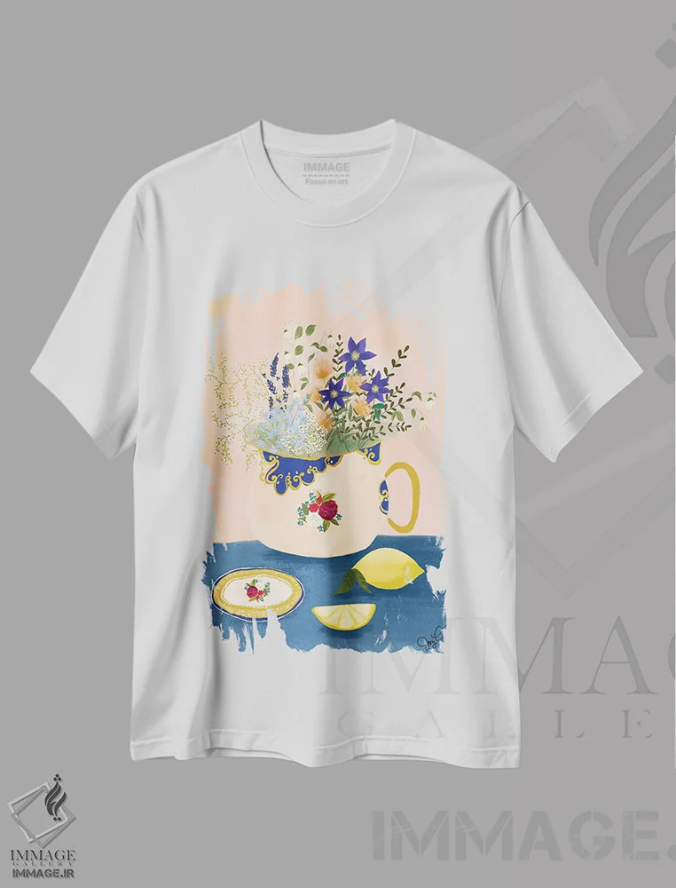 تیشرت سفید طرح دار طبیعت بی جان صورتی گلگون، دکور بوهمی اثر جوی لافرم | فروشگاه ایماژ تیشرت طرح دار طبیعت بی جان صورتی گلگون اثر جوی لافرم