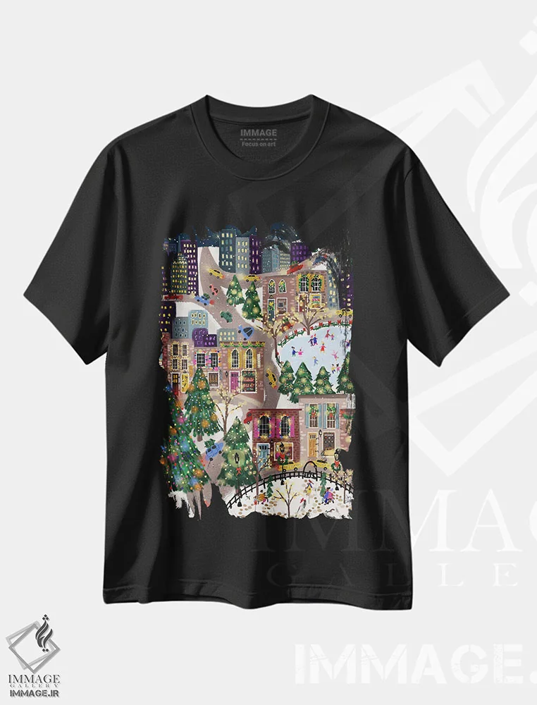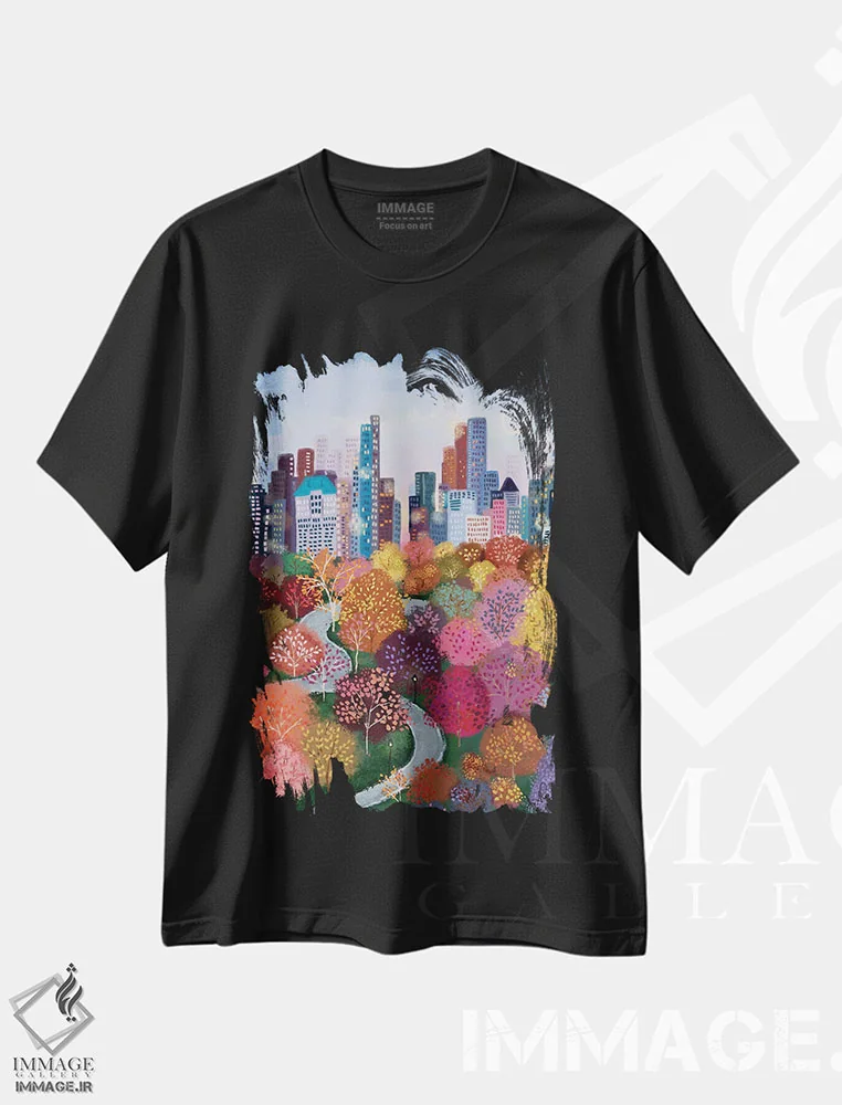 تیشرت مشکی طرح دار شهر درخشان، تزئینی اثر جوی لافرم | فروشگاه ایماژ تیشرت طرح دار شهر درخشان اثر جوی لافرم
