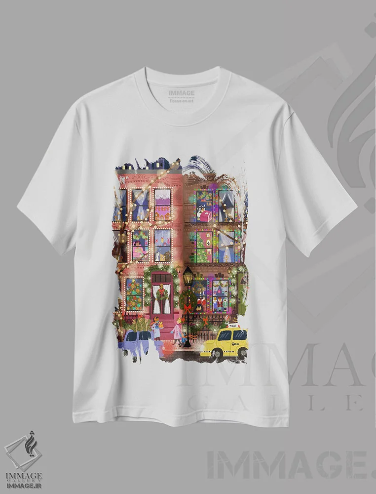 تیشرت سفید طرح دار خانه های ردیفی کریسمسی، تزئینی اثر جوی لافرم | فروشگاه ایماژ تیشرت طرح دار خانه های ردیفی کریسمسی اثر جوی لافرم