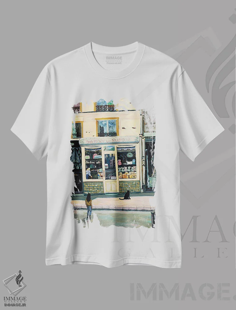 تیشرت مشکی طرح دار فروشگاه های کنار رود سن، تزئینی اثر دبورا ایو آلاسترا | فروشگاه ایماژ تیشرت طرح دار فروشگاه های کنار رود سن اثر دبورا ایو آلاسترا