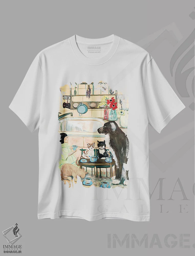 تیشرت سفید طرح دار دوستان گربه سان، هنر فاخر معاصر اثر دبورا ایو آلاسترا | فروشگاه ایماژ تیشرت طرح دار دوستان گربه سان اثر دبورا ایو آلاسترا