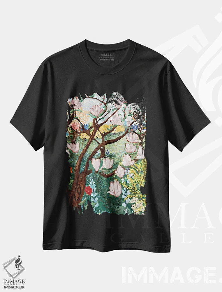 تیشرت مشکی طرح دار شکوفه های مگنولیا، هنر فاخر معاصر اثر دبورا ایو آلاسترا | فروشگاه ایماژ تیشرت طرح دار شکوفه های مگنولیا اثر دبورا ایو آلاسترا
