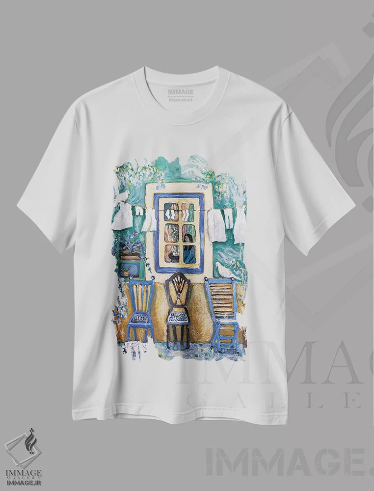 تیشرت سفید طرح دار عصر روی ایوان، مدیوم اثر دبورا ایو آلاسترا | فروشگاه ایماژ تیشرت طرح دار عصر روی ایوان اثر دبورا ایو آلاسترا