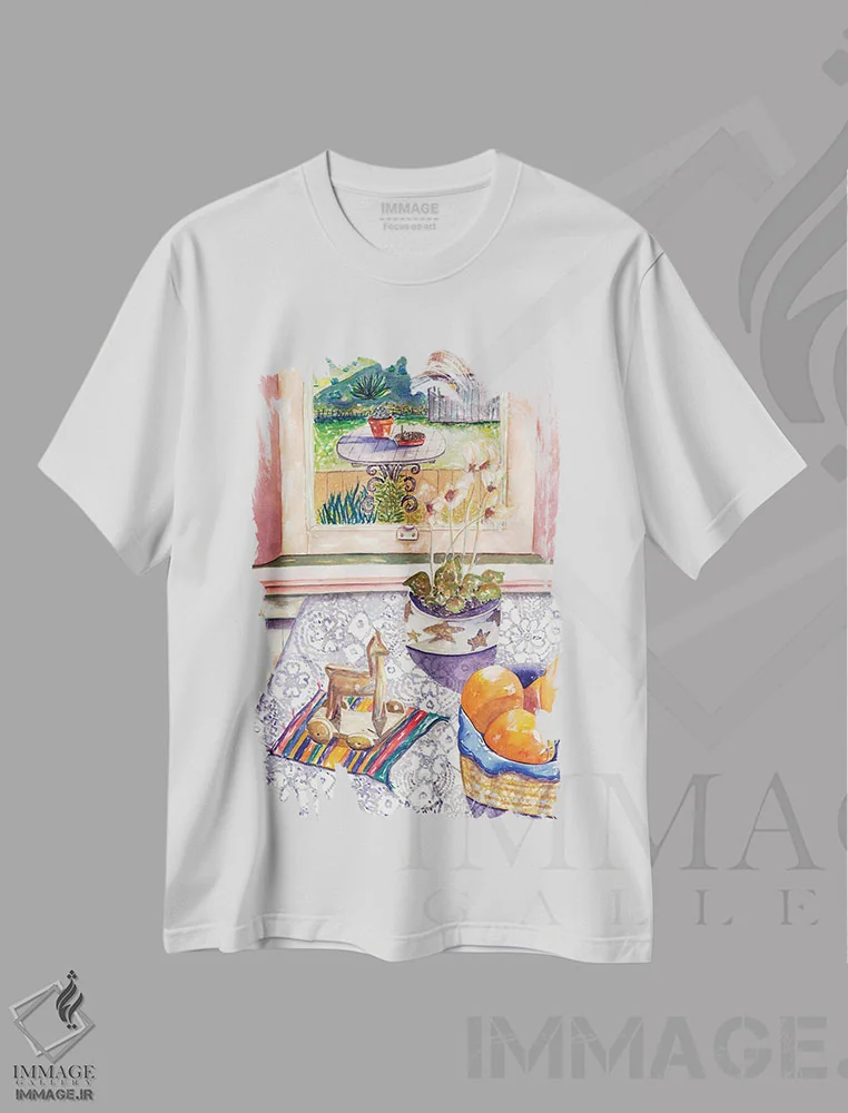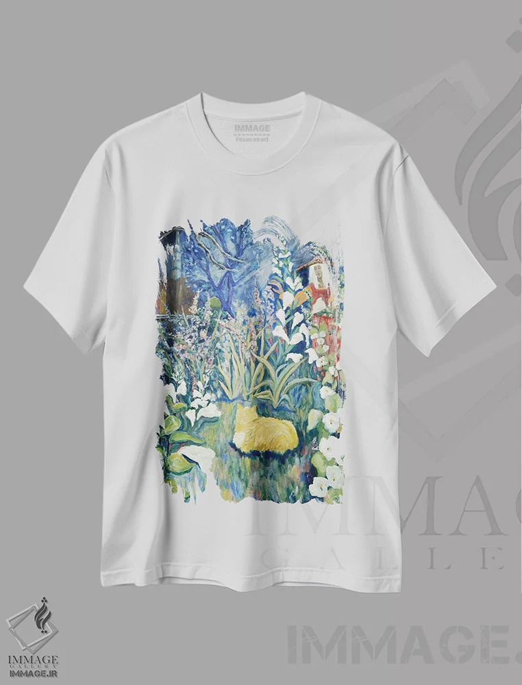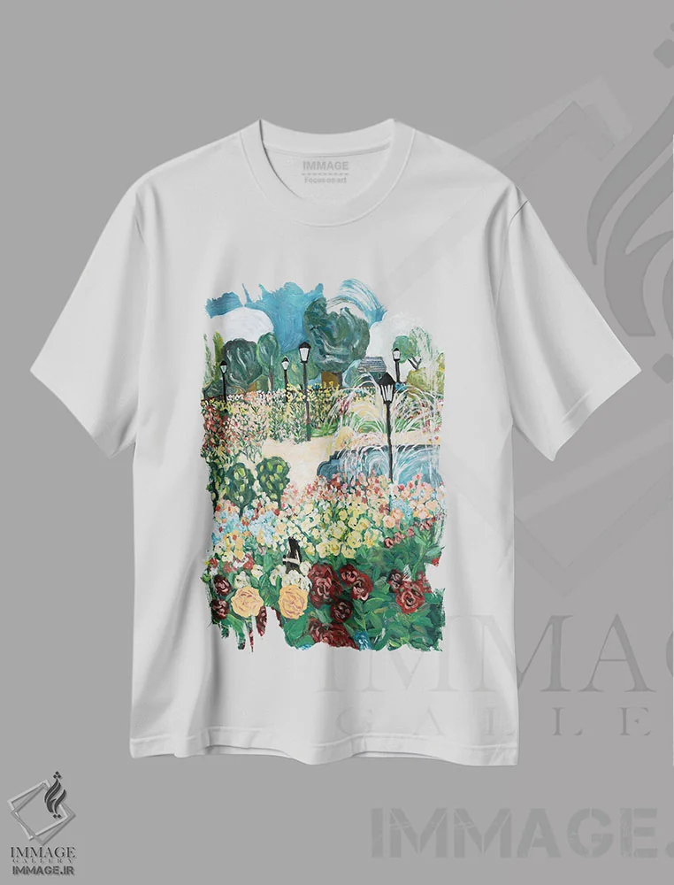 تیشرت سفید طرح دار نمای باغ، دکور معاصر اثر دبورا ایو آلاسترا | فروشگاه ایماژ تیشرت طرح دار نمای باغ اثر دبورا ایو آلاسترا