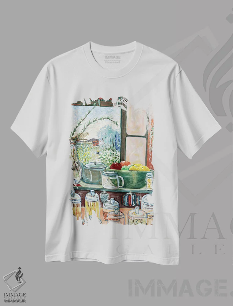 تیشرت سفید طرح دار آشپزخانهٔ من، هنر فاخر معاصر اثر دبورا ایو آلاسترا | فروشگاه ایماژ تیشرت طرح دار آشپزخانهٔ من اثر دبورا ایو آلاسترا