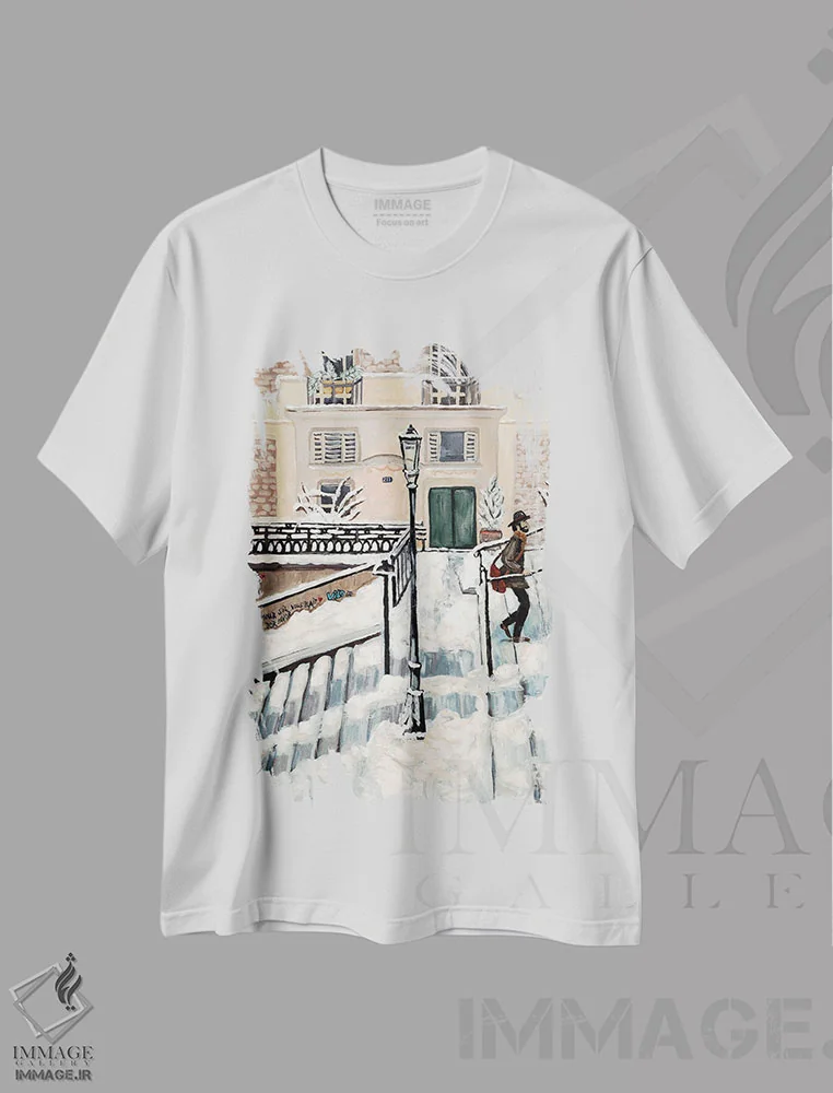 تیشرت سفید طرح دار برف مونمارتر، هنر فاخر معاصر اثر دبورا ایو آلاسترا | فروشگاه ایماژ تیشرت طرح دار برف مونمارتر اثر دبورا ایو آلاسترا