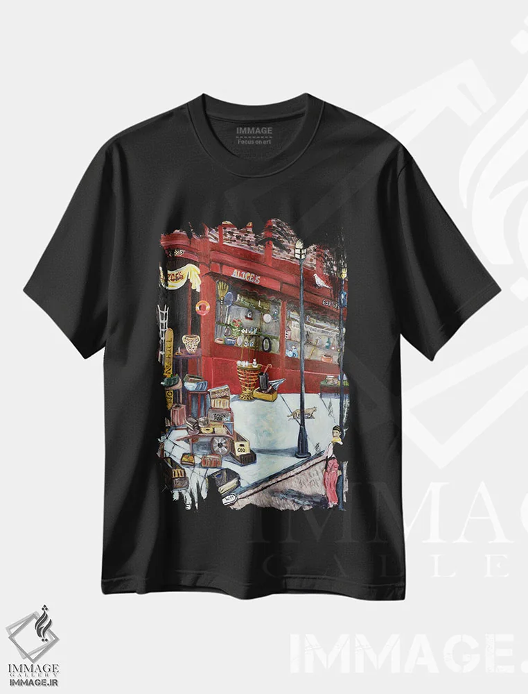 تیشرت مشکی طرح دار کوچه شکوفه، هنر فاخر معاصر اثر دبورا ایو آلاسترا | فروشگاه ایماژ تیشرت طرح دار کوچه شکوفه اثر دبورا ایو آلاسترا