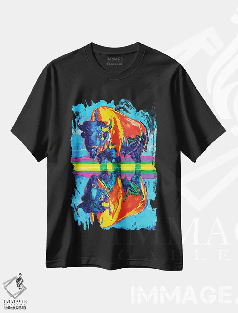 تیشرت مشکی طرح دار انعکاس های گاومیش آمریکایی، دکور کلبه و لژ اثر دریک هیگینز | فروشگاه ایماژ تیشرت طرح دار انعکاس های گاومیش آمریکایی اثر دریک هیگینز