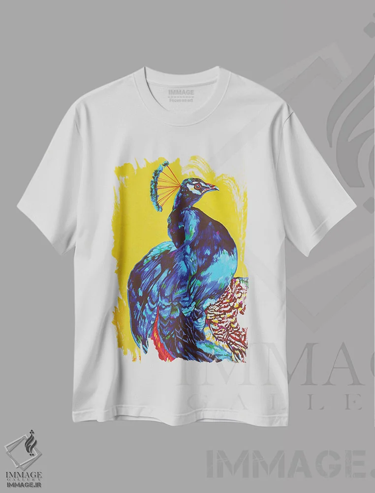 تیشرت سفید طرح دار طاووس، هنر فاخر معاصر اثر دریک هیگینز | فروشگاه ایماژ تیشرت طرح دار طاووس اثر دریک هیگینز