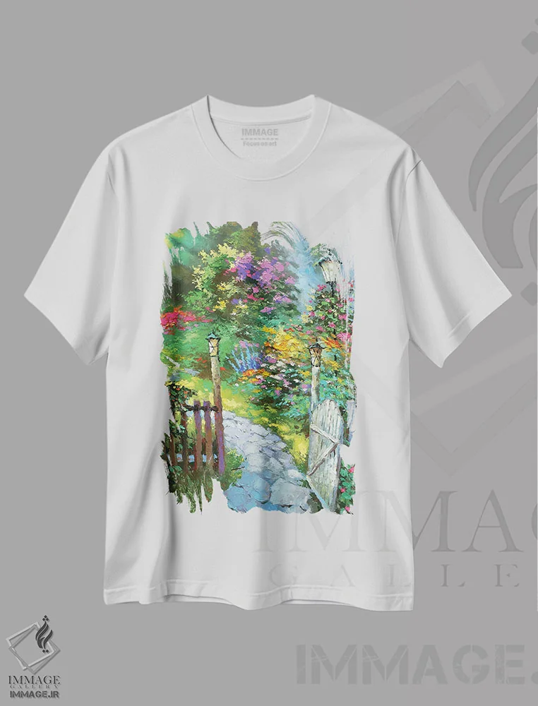 تیشرت سفید طرح دار طلوع در باغ، مدیوم اثر دمیتری اسپیروس | فروشگاه ایماژ تیشرت طرح دار طلوع در باغ اثر دمیتری اسپیروس