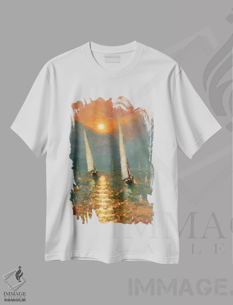 تیشرت سفید طرح دار غروب ششم، دکور ساحلی اثر دمیتری اولین | فروشگاه ایماژ تیشرت طرح دار غروب ششم اثر دمیتری اولین