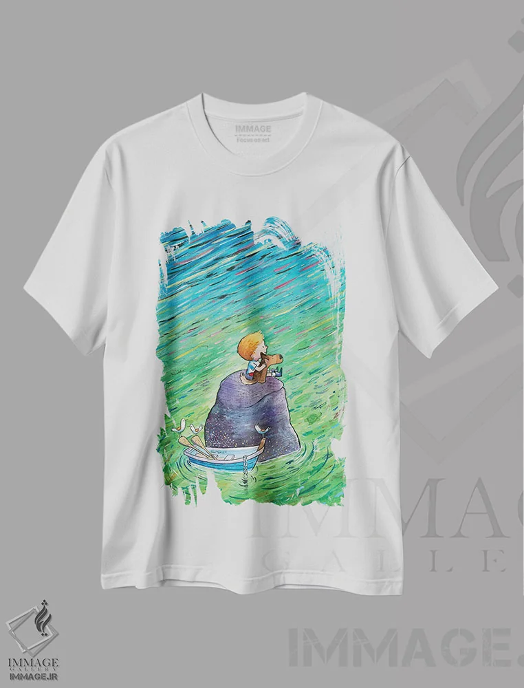 تیشرت سفید طرح دار پسر و ستاره ها، مدیوم اثر دن تاویس | فروشگاه ایماژ تیشرت طرح دار پسر و ستاره ها اثر دن تاویس