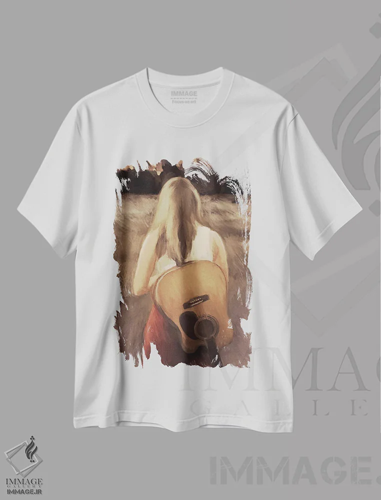 تیشرت سفید طرح دار سفر با گیتارم، دکور روستایی اثر دن منیلی | فروشگاه ایماژ تیشرت طرح دار سفر با گیتارم اثر دن منیلی