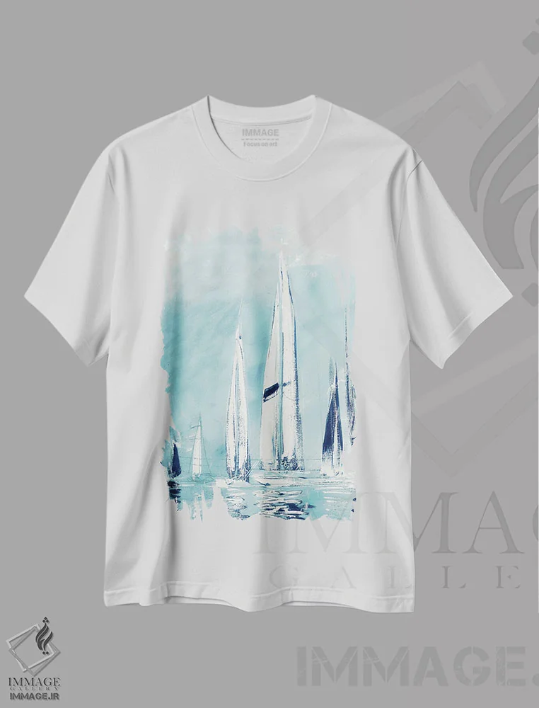 تیشرت سفید طرح دار بادبان های بلند خیالی، مدیوم اثر دن منیلی | فروشگاه ایماژ تیشرت طرح دار بادبان های بلند خیالی اثر دن منیلی