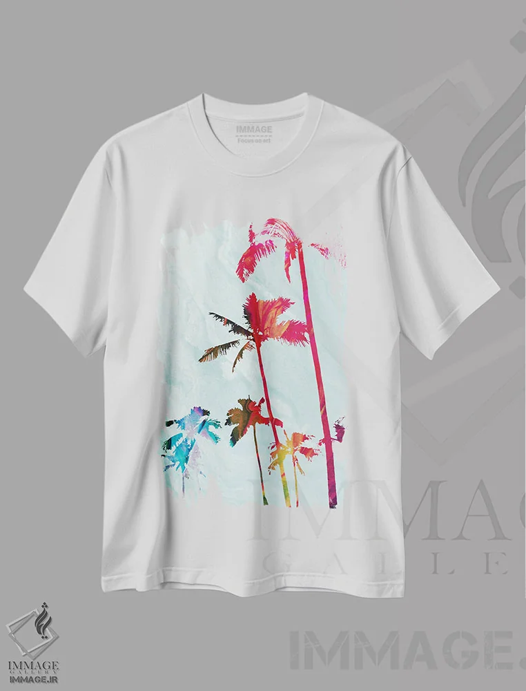 تیشرت سفید طرح دار نخل های رنگی، تزئینی اثر دن منیلی | فروشگاه ایماژ تیشرت طرح دار نخل های رنگی اثر دن منیلی