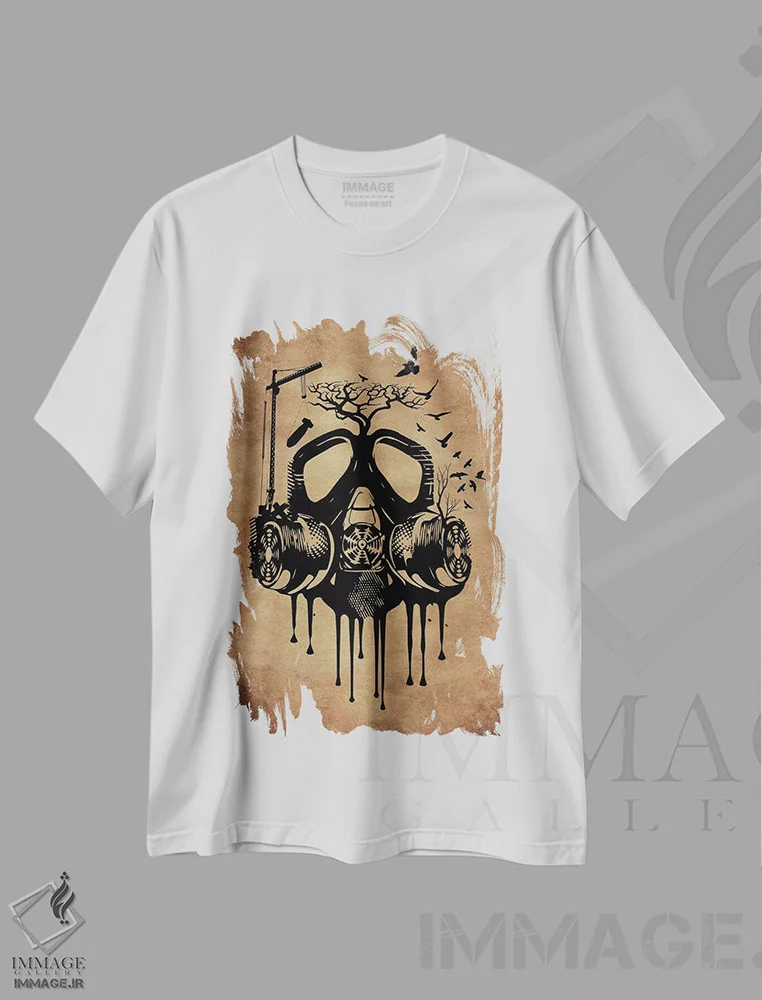 تیشرت سفید طرح دار ماسک گاز، دکوراسیون جایگزین اثر دورو آرت | فروشگاه ایماژ تیشرت طرح دار ماسک گاز اثر دورو آرت