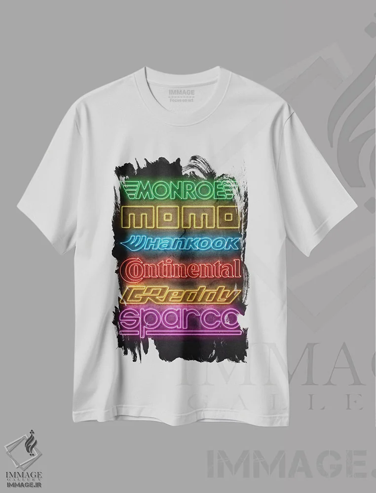 تیشرت سفید طرح دار اسپانسرهای ماشین نئونی I، هنر دیجیتال اثر دورو آرت | فروشگاه ایماژ تیشرت طرح دار اسپانسرهای ماشین نئونی I اثر دورو آرت