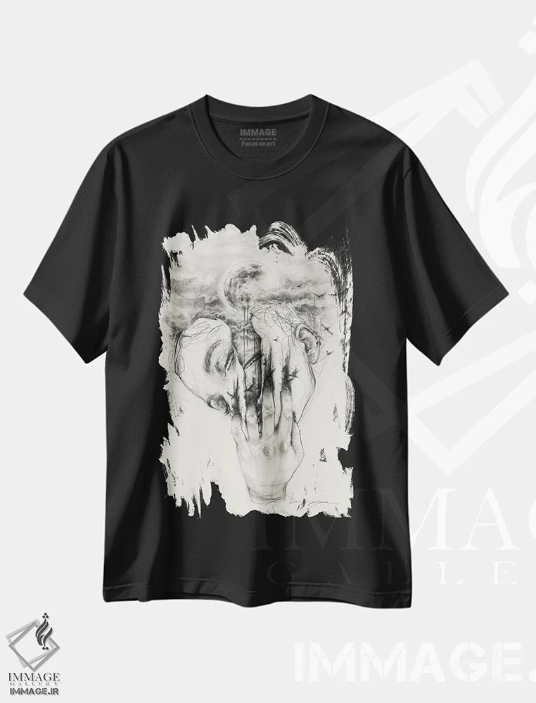 تیشرت مشکی طرح دار خیالبافی، دست نقاشی و طراحی دستی اثر دوریانا پوپا | فروشگاه ایماژ