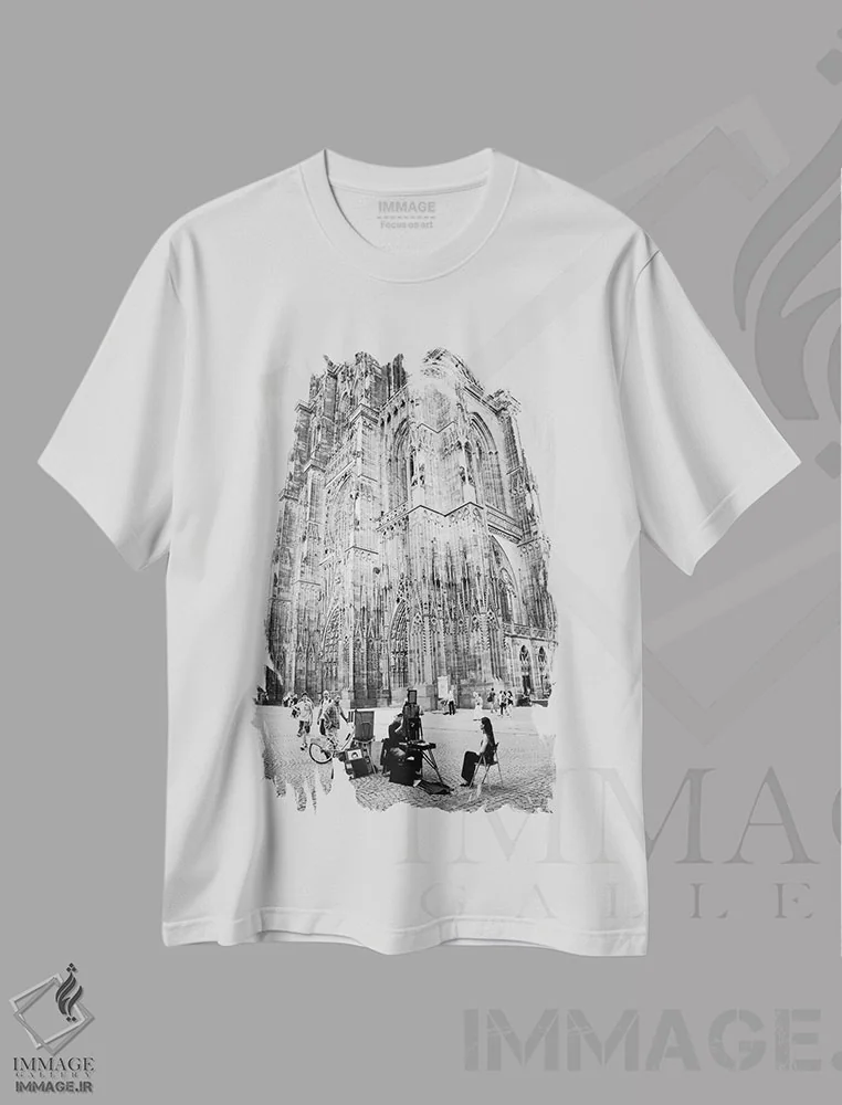 تیشرت سفید طرح دار کلیسای جامع نوتردام استراسبورگ، عکاسی سیاه و سفید اثر دوریت فوگ | فروشگاه ایماژ