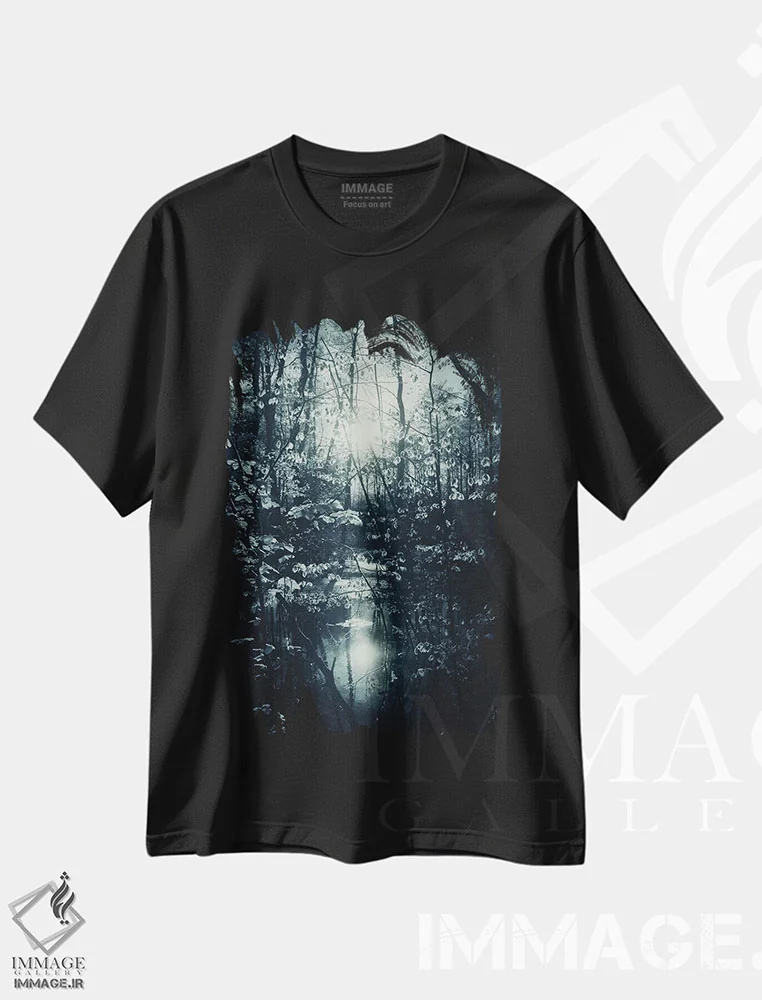تیشرت مشکی طرح دار جنگل افسانه ای، عکاسی سیاه و سفید اثر دوریت فوگ | فروشگاه ایماژ