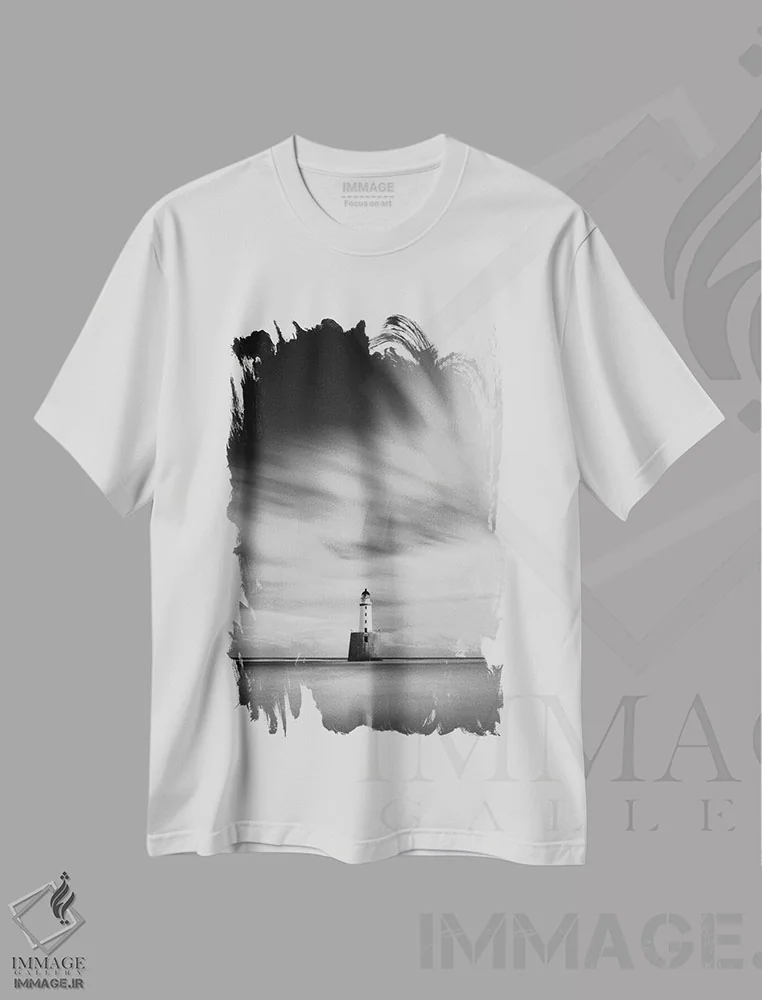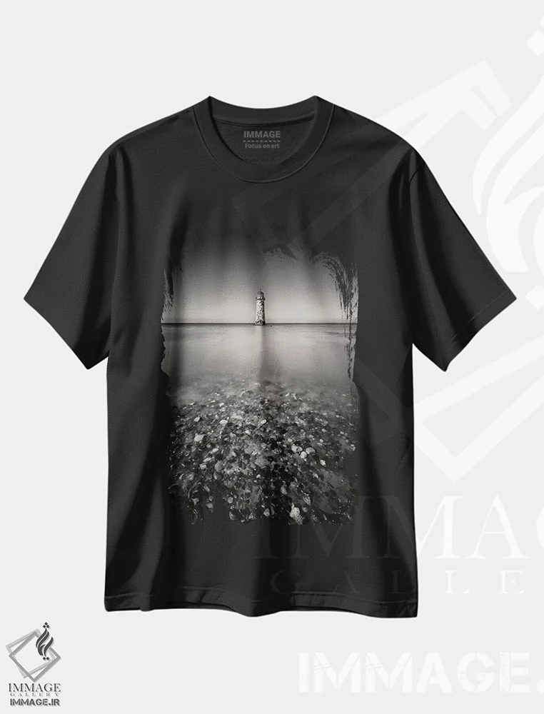 تیشرت مشکی طرح دار فانوس دریایی تالاکر، عکاسی سیاه و سفید اثر دیو بومن | فروشگاه ایماژ تیشرت طرح دار فانوس دریایی تالاکر اثر دیو بومن