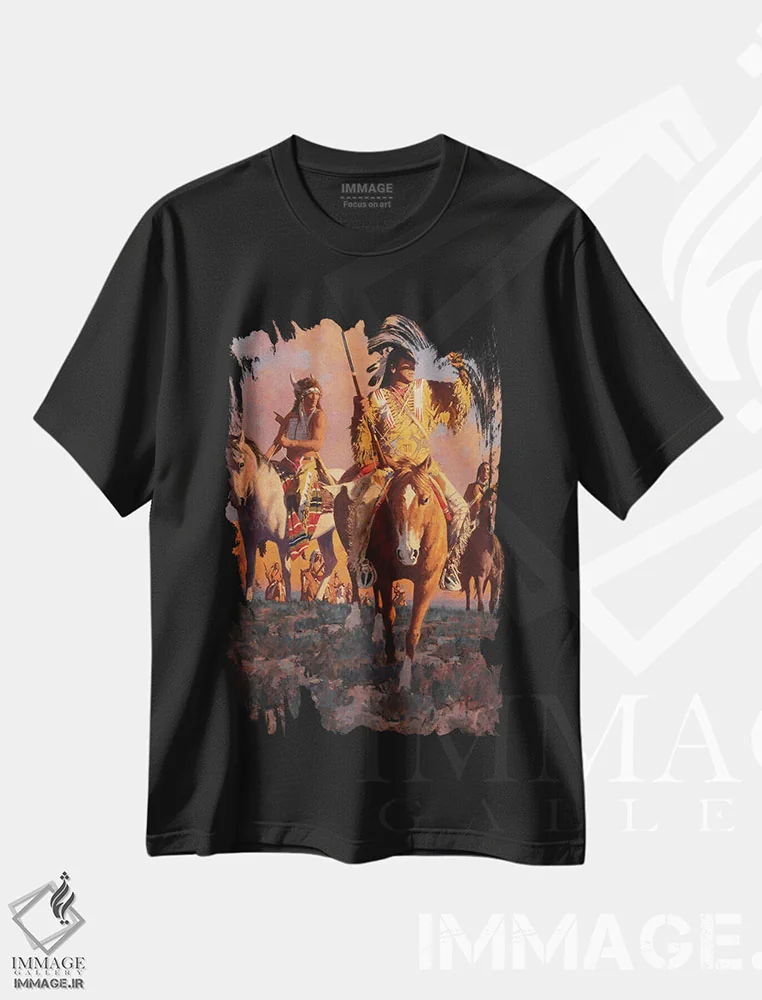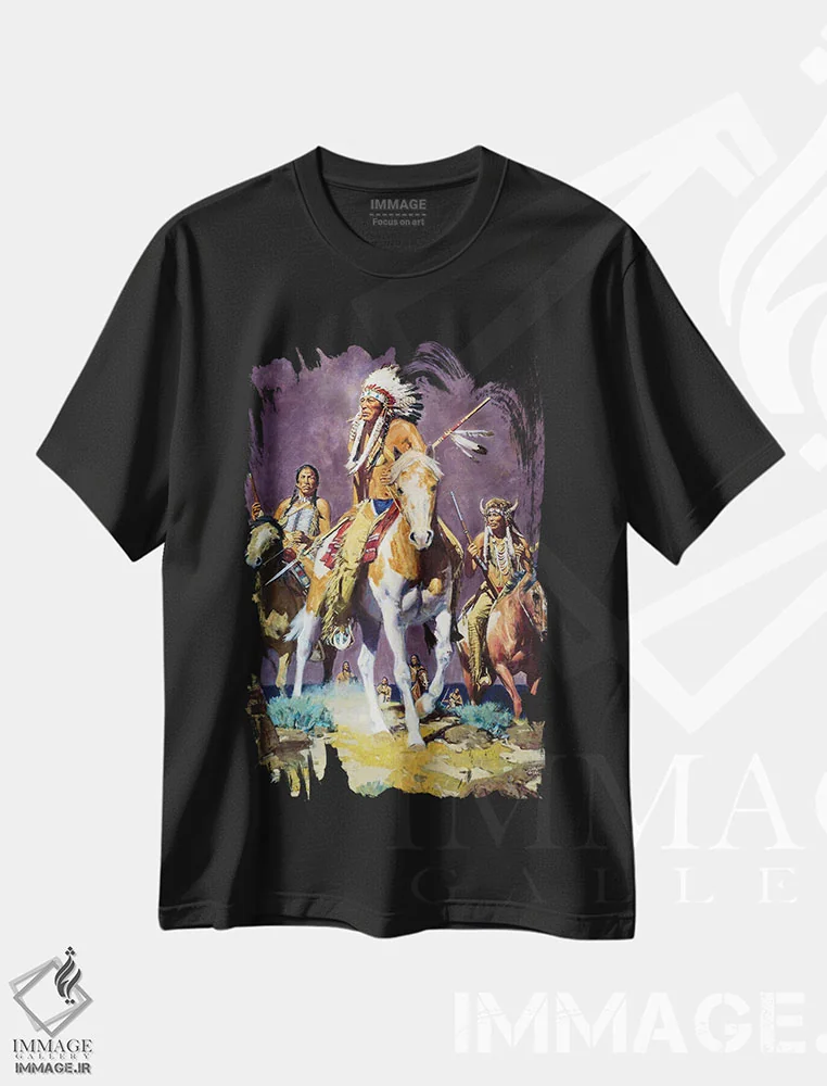 تیشرت مشکی طرح دار – تیشرت هنری بومی ,"ردای بوفالوی سفید " اثر دیوید من فروشگاه ایماژ تیشرت طرح هنری بومی ,"ردای بوفالوی سفید " اثر دیوید من