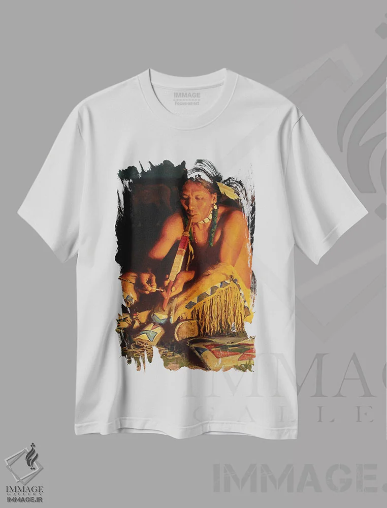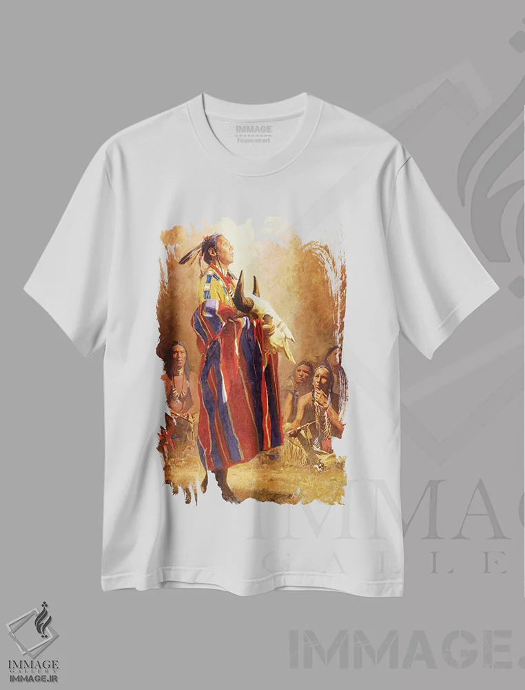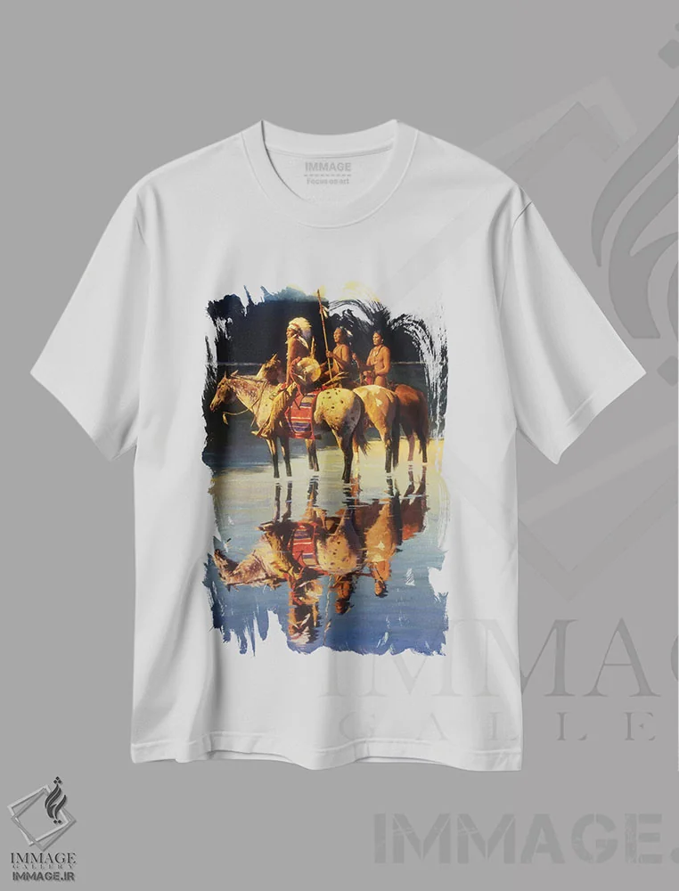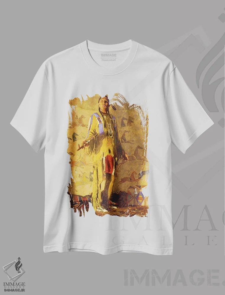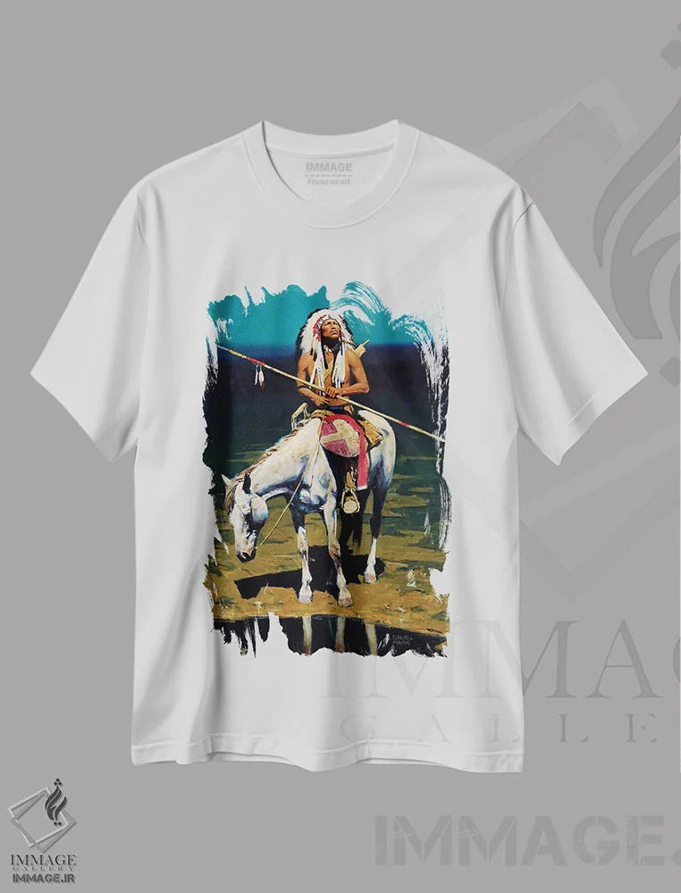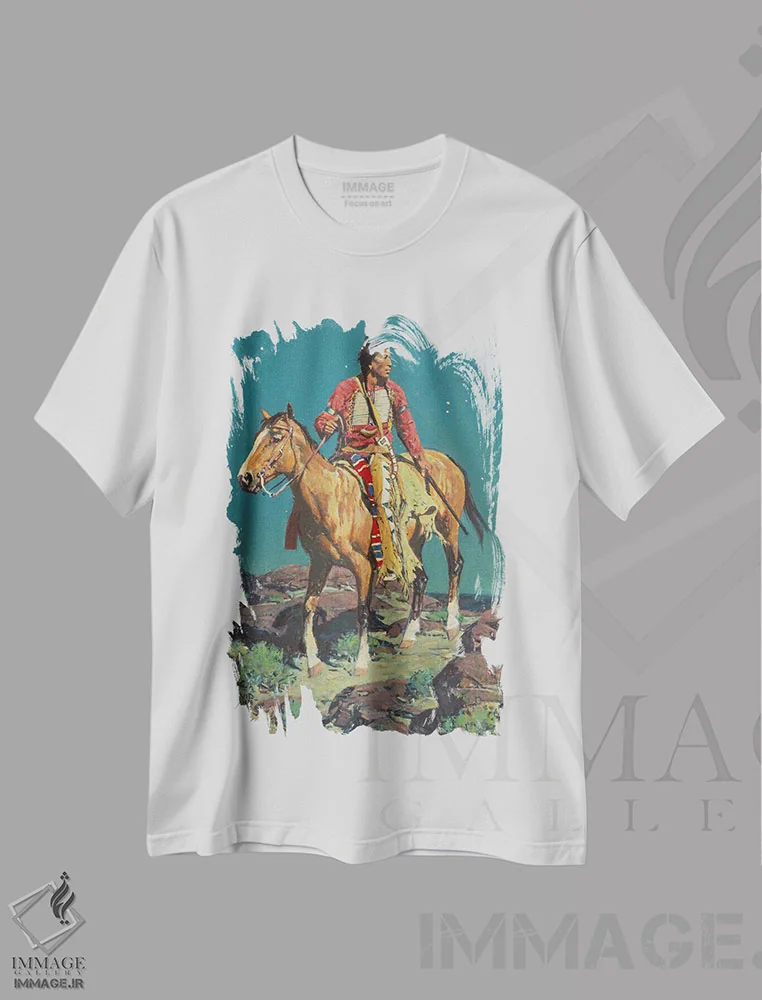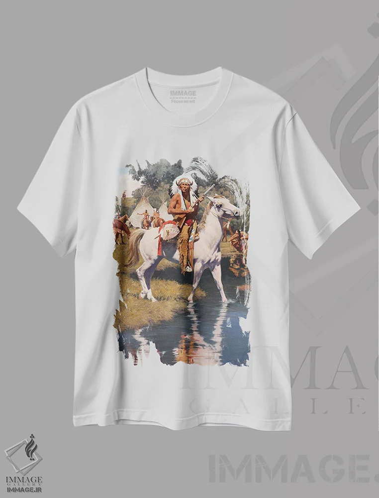 تیشرت سفید طرح دار – تیشرت هنری بومی ,"نگهبان پونی" اثر دیوید من فروشگاه ایماژ تیشرت طرح هنری بومی ,"نگهبان پونی" اثر دیوید من