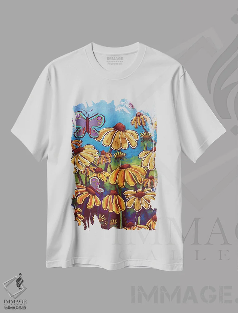 تیشرت سفید طرح دار قدرت گل آفتابگردان، تزئینی اثر دیویدای هینْدز | فروشگاه ایماژ تیشرت طرح دار قدرت گل آفتابگردان اثر دیویدای هینْدز