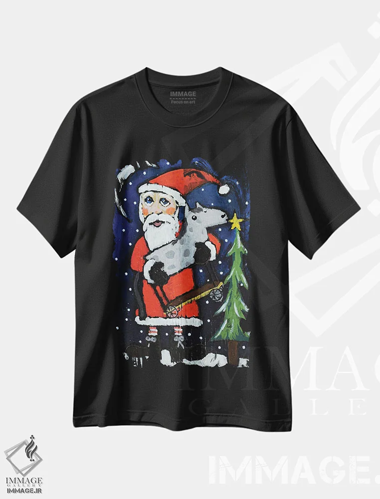 تیشرت مشکی طرح دار اسب بازی بابانوئل، دکور تعطیلات اثر دیویدای هینْدز | فروشگاه ایماژ تیشرت طرح دار اسب بازی بابانوئل اثر دیویدای هینْدز
