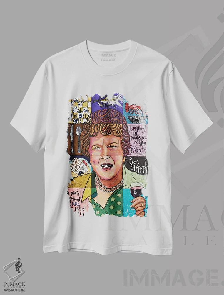 تیشرت سفید طرح دار کلاژ جولیا چایلد، دست نقاشی و طراحی دستی اثر دیویدای هینْدز | فروشگاه ایماژ تیشرت طرح دار کلاژ جولیا چایلد اثر دیویدای هینْدز