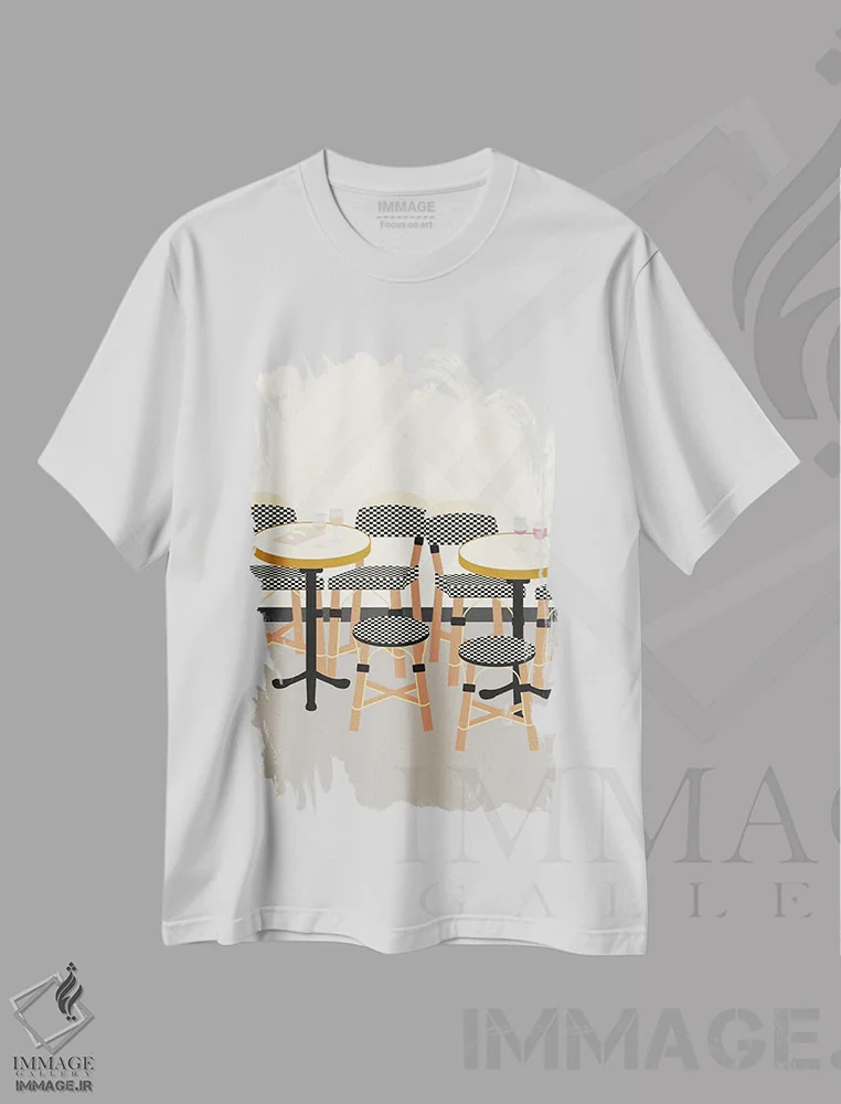 تیشرت سفید طرح دار "صندلی های کافه پاریس"، تزئینی اثر لایمن کریتیو کو. | فروشگاه ایماژ تیشرت طرح دار "صندلی های کافه پاریس" اثر لایمن کریتیو کو.