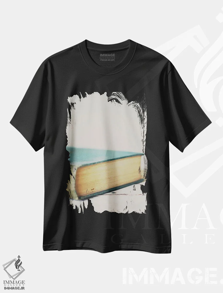 تیشرت مشکی طرح دار یک جلد کتاب، تزئینی اثر لورا ایوانز | فروشگاه ایماژ تیشرت طرح دار یک جلد کتاب اثر لورا ایوانز