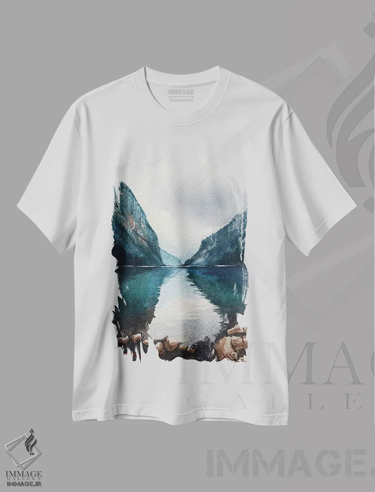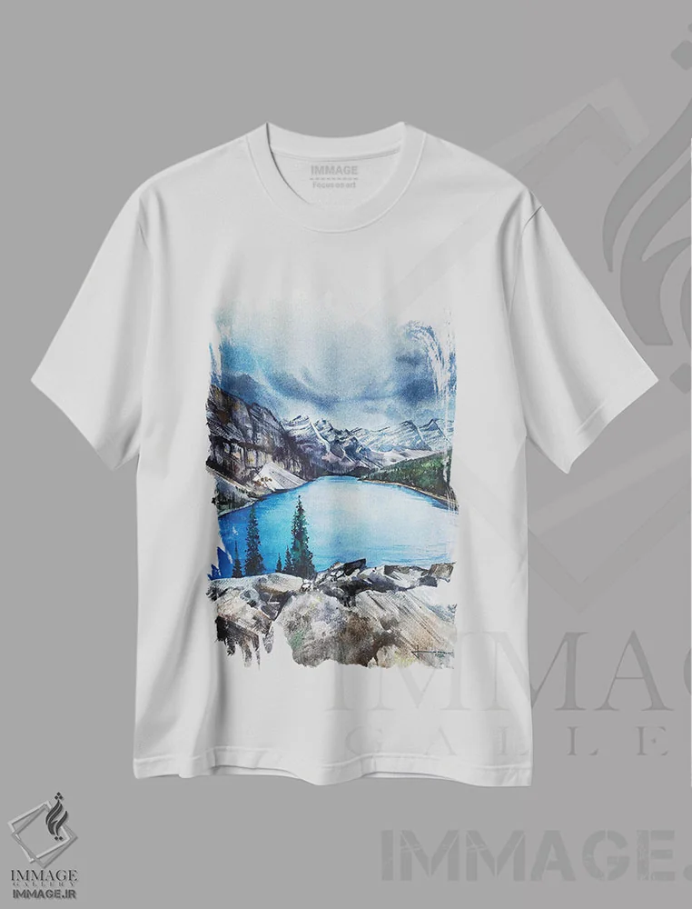 تیشرت سفید طرح دار دریاچه لوییس II، دکور کلبه و لژ اثر لیام کوموات | فروشگاه ایماژ تیشرت طرح دار دریاچه لوییس II اثر لیام کوموات
