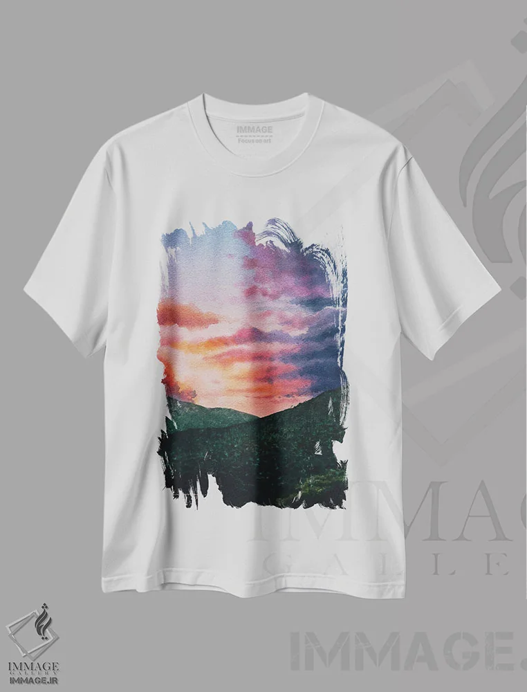 تیشرت سفید طرح دار غروب پاستلی، هنر فاخر معاصر اثر لیام کوموات | فروشگاه ایماژ تیشرت طرح دار غروب پاستلی اثر لیام کوموات