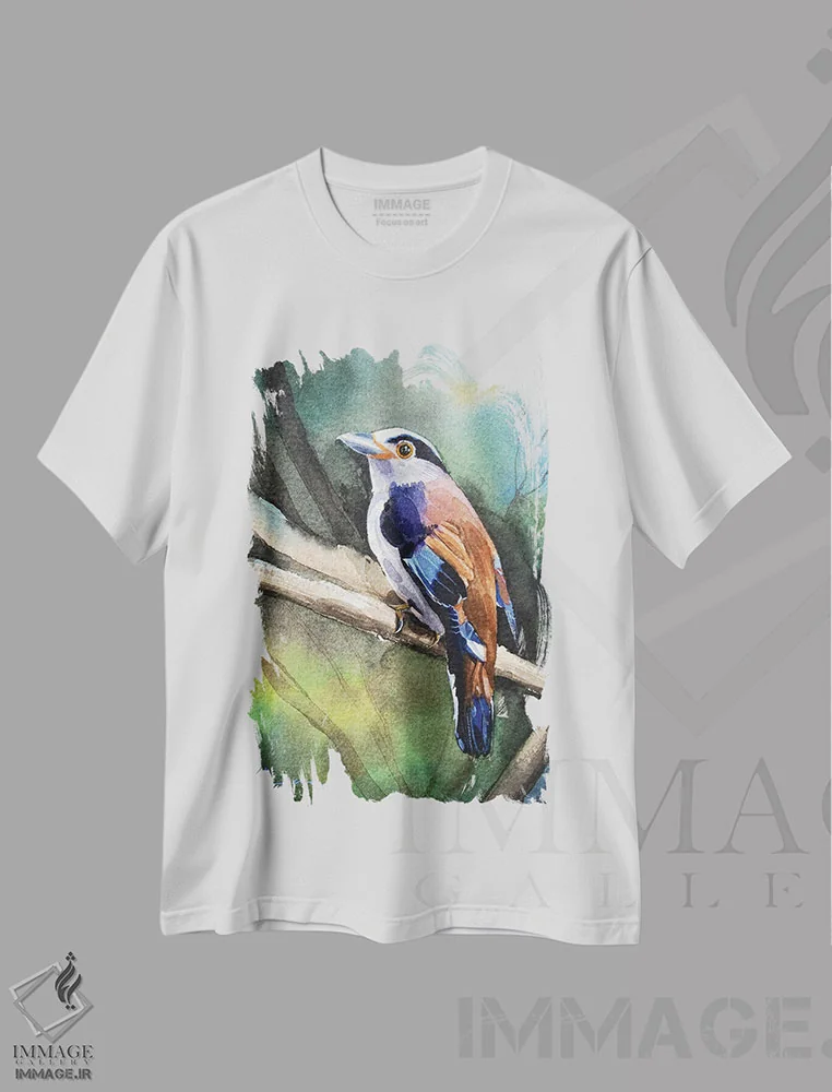 تیشرت سفید طرح دار پرنده نشسته II، دکور کلبه و لژ اثر لیام کوموات | فروشگاه ایماژ تیشرت طرح دار پرنده نشسته II اثر لیام کوموات