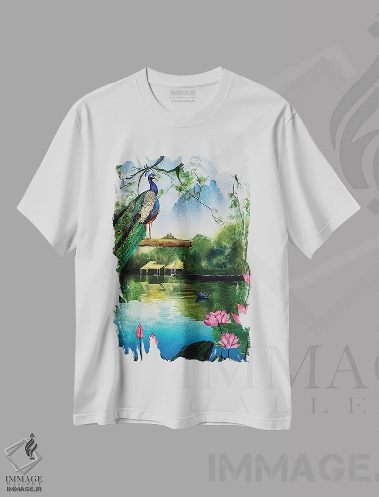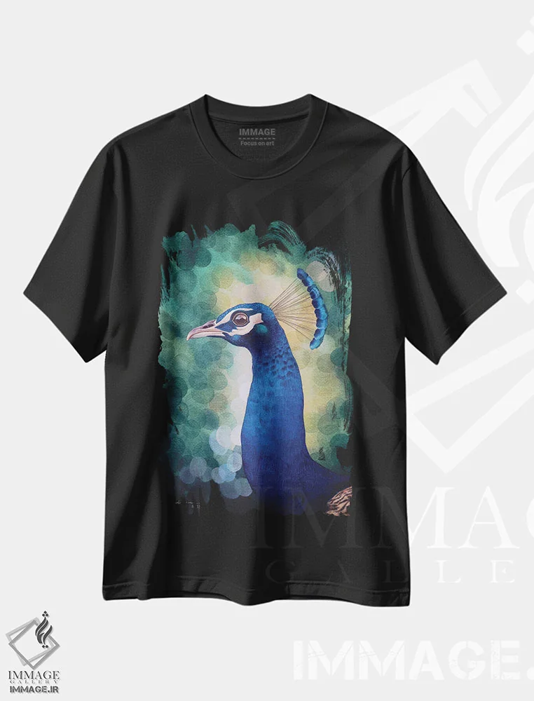 تیشرت مشکی طرح دار طاووس، هنر فاخر معاصر اثر لیام کوموات | فروشگاه ایماژ تیشرت طرح دار طاووس اثر لیام کوموات