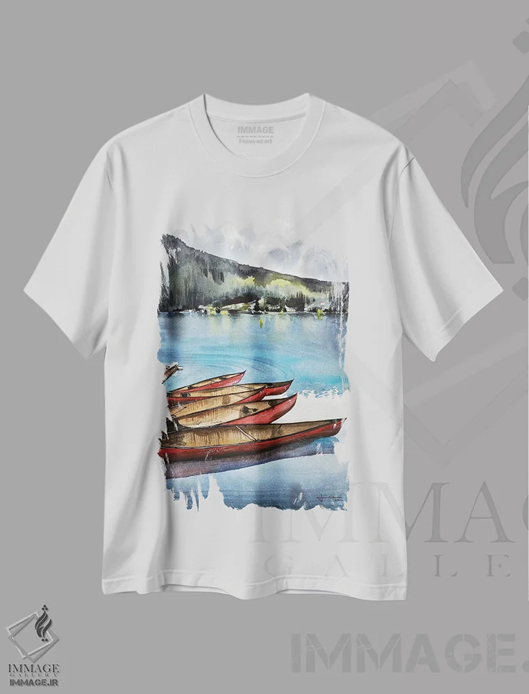 تیشرت سفید طرح دار قایق قرمز، دکور کلبه و لژ اثر لیام کوموات | فروشگاه ایماژ تیشرت طرح دار قایق قرمز اثر لیام کوموات