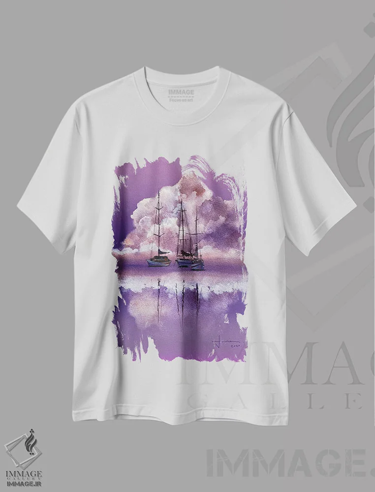 تیشرت سفید طرح دار افق بنفش، تزئینی اثر لیام کوموات | فروشگاه ایماژ تیشرت طرح دار افق بنفش اثر لیام کوموات