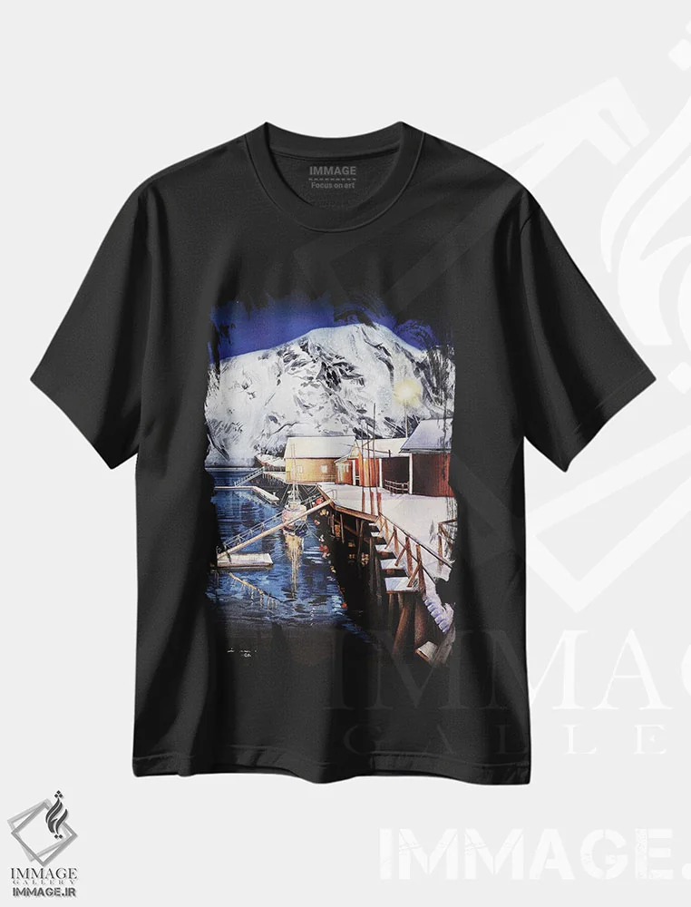 تیشرت مشکی طرح دار بندرگاه، دکور کلبه و لژ اثر لیام کوموات | فروشگاه ایماژ تیشرت طرح دار بندرگاه اثر لیام کوموات