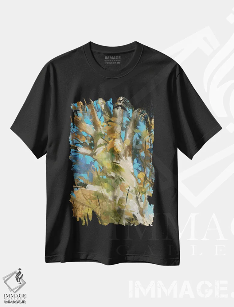 تیشرت مشکی طرح دار درخت بلوط، آبستره اثر لیز جاردین | فروشگاه ایماژ تیشرت طرح دار درخت بلوط اثر لیز جاردین