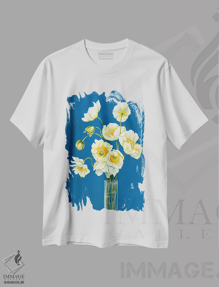 تیشرت سفید طرح دار خشخاش های یخ زده، دکور معاصر اثر لیز جاردین | فروشگاه ایماژ تیشرت طرح دار خشخاش های یخ زده اثر لیز جاردین