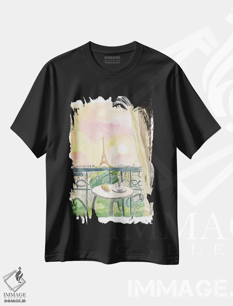 تیشرت مشکی طرح دار – تیشرت هنری ,"نمای بالکن پاریس فرانسه با کروسان و قهوه" اثر مارکوس و مارتینا بلیشنر فروشگاه ایماژ تیشرت طرح هنری ,"نمای بالکن پاریس فرانسه با کروسان و قهوه" اثر مارکوس و مارتینا بلیشنر