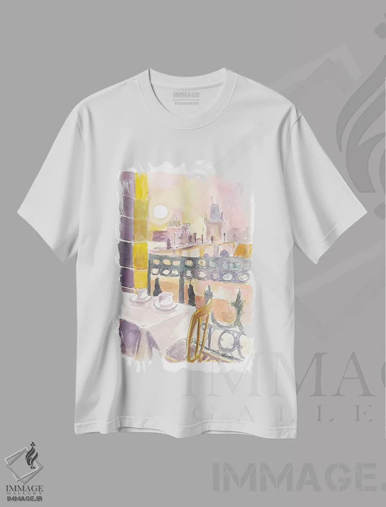 تیشرت سفید طرح دار – تیشرت هنری ,"میز کافه در پراگ جمهوری چک با نمای پل کارلوف" اثر مارکوس و مارتینا بلیشنر فروشگاه ایماژ تیشرت طرح هنری ,"میز کافه در پراگ جمهوری چک با نمای پل کارلوف" اثر مارکوس و مارتینا بلیشنر