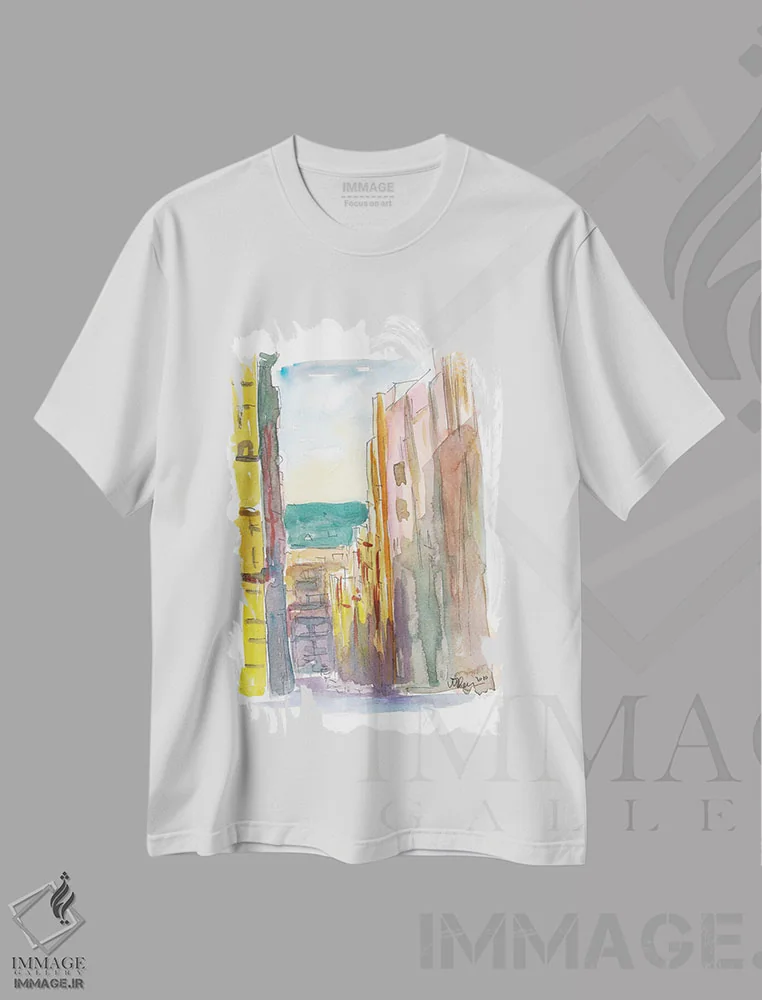 تیشرت سفید طرح دار – تیشرت هنری ,"کوچه باریک آلته اسپانیا با منظره دریا در کاستا بلانکا" اثر مارکوس و مارتینا بلیشنر فروشگاه ایماژ تیشرت طرح هنری ,"کوچه باریک آلته اسپانیا با منظره دریا در کاستا بلانکا" اثر مارکوس و مارتینا بلیشنر