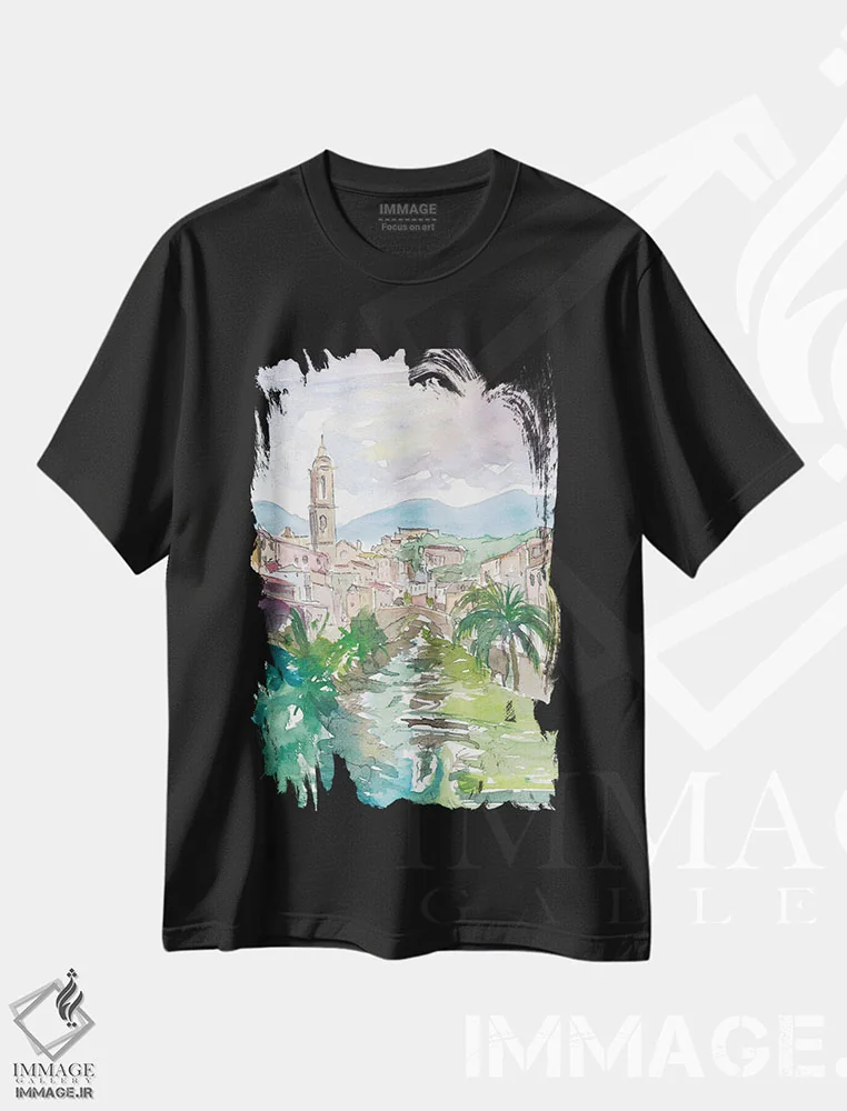 تیشرت مشکی طرح دار – تیشرت طبیعت ,شهرک روستایی لیگوریا ایتالیا با نهر و پل اثر مارکوس و مارتینا بلیشنر فروشگاه ایماژ تیشرت طرح طبیعت ,شهرک روستایی لیگوریا ایتالیا با نهر و پل اثر مارکوس و مارتینا بلیشنر