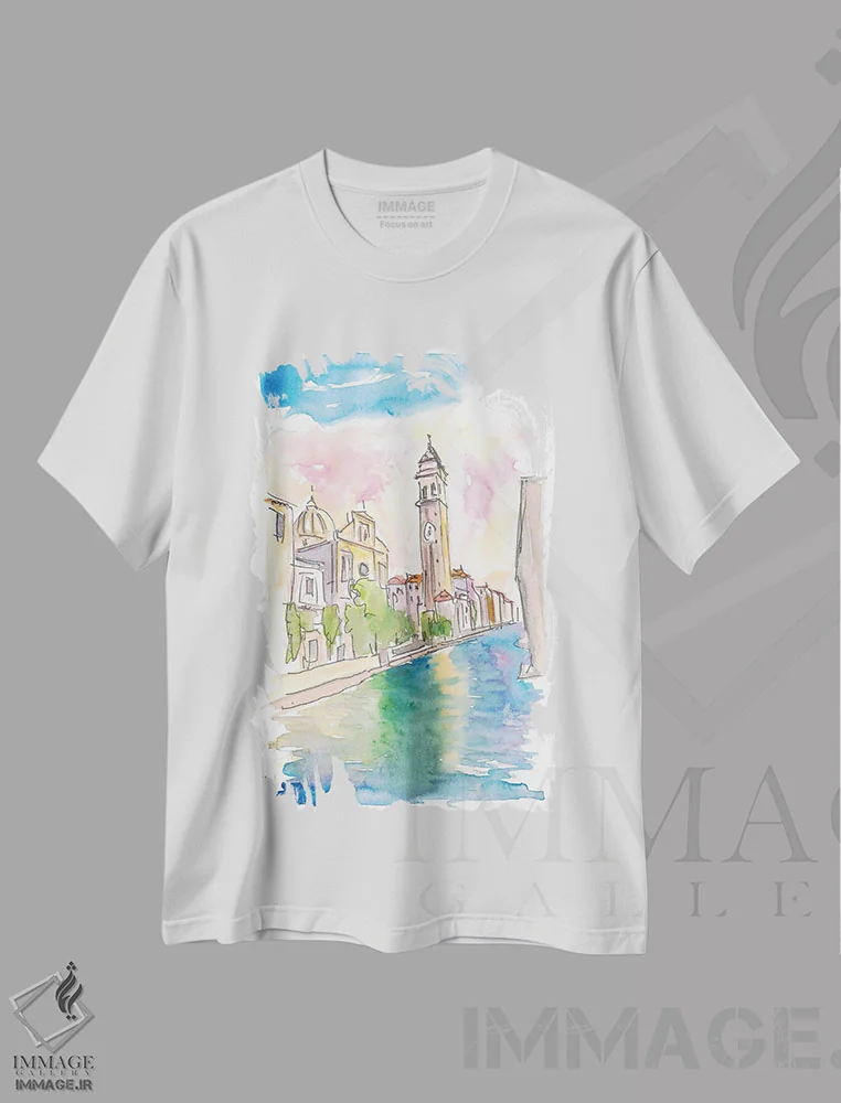 تیشرت سفید طرح دار – تیشرت منظره شهری ,کلیسای سن جورجیو دی گریچی و ناقوس خانه کج در ونیز اثر مارکوس و مارتینا بلیشنر فروشگاه ایماژ تیشرت طرح منظره شهری ,کلیسای سن جورجیو دی گریچی و ناقوس خانه کج در ونیز اثر مارکوس و مارتینا بلیشنر