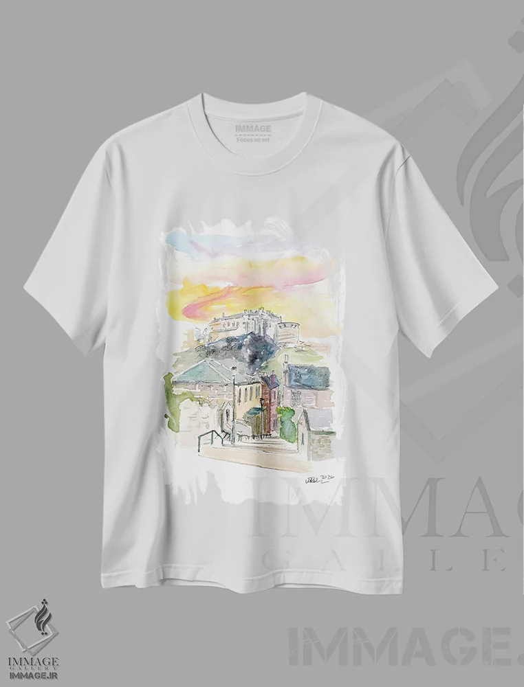 تیشرت سفید طرح دار – تیشرت منظره ,نمای خیابان ادینبورگ اسکاتلند همراه با قلعه در غروب اثر مارکوس و مارتینا بلیشنر فروشگاه ایماژ تیشرت طرح منظره ,نمای خیابان ادینبورگ اسکاتلند همراه با قلعه در غروب اثر مارکوس و مارتینا بلیشنر